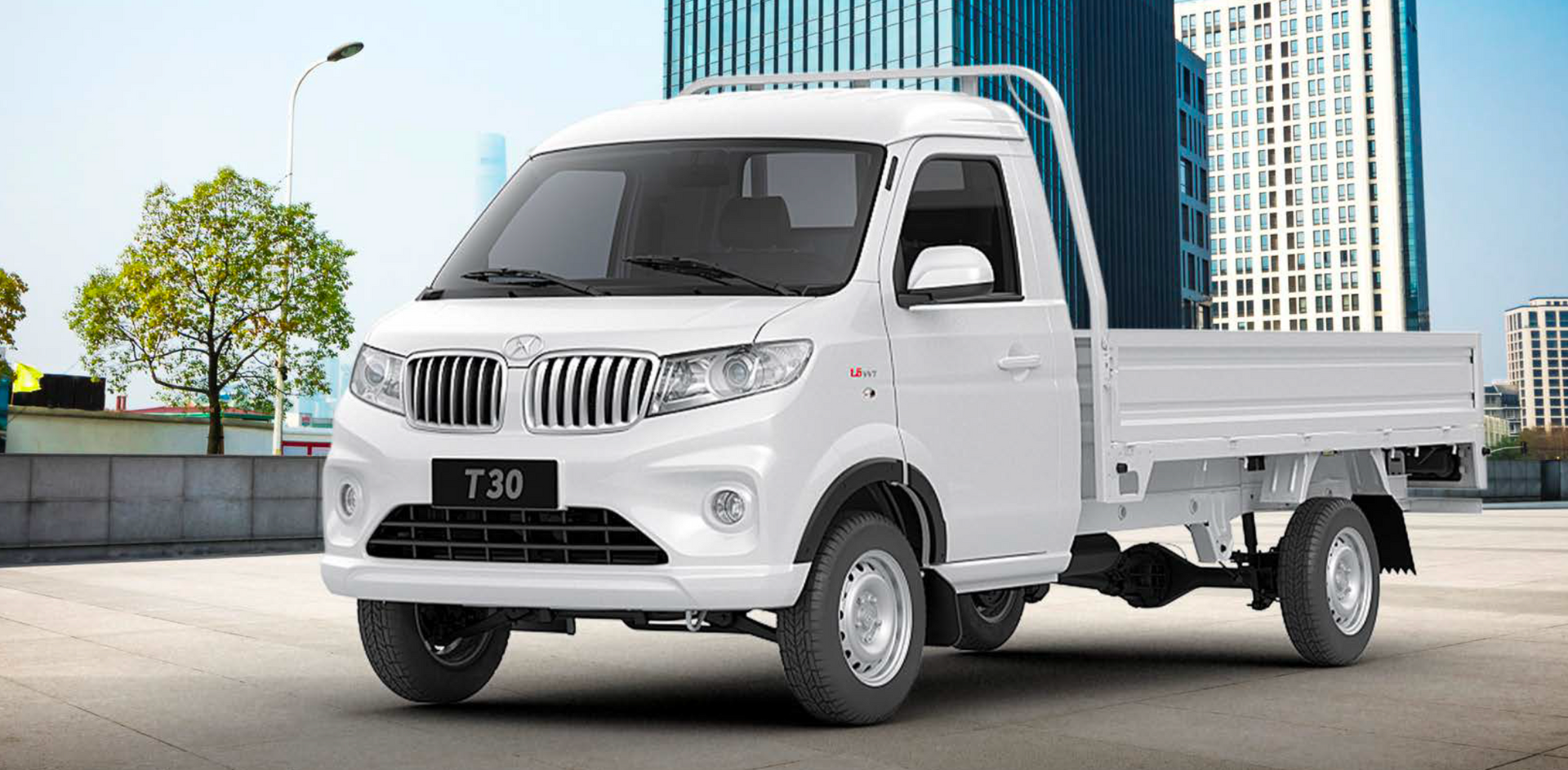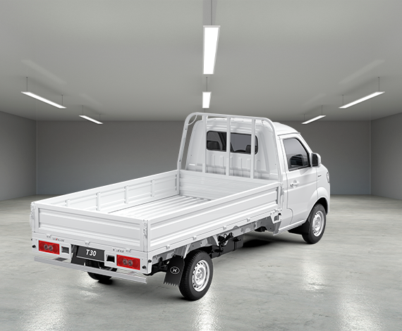 El T30 es un Mini Truck de cabina simple diseñado específicamente para el trabajo. Se presenta como un vehículo práctico con dimensiones ampliadas para maximizar la eficiencia en labores de carga, incluyendo equipamiento funcional como neblineros delanteros, guardafangos y una rueda de repuesto de tamaño completo.