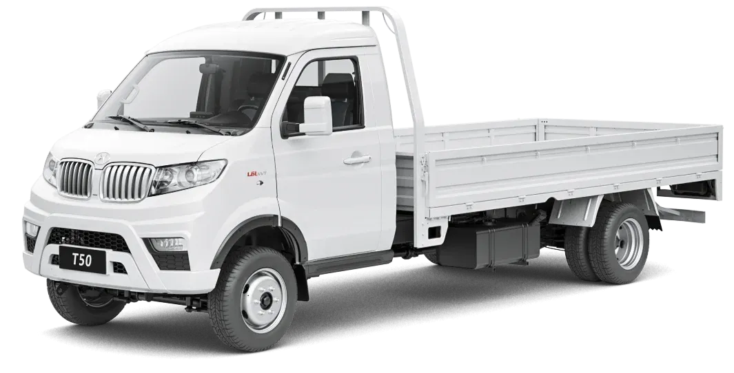 El T50 se presenta como el "campeón de la pega" en el segmento de MiniTrucks, diseñado con un tamaño y motor superiores para ofrecer mayor potencia y capacidad de carga. Su diseño exterior es práctico e incluye neblineros delanteros, guardafangos, una parrilla cromada y una rueda de repuesto de tamaño completo. Con una longitud total de 5,840 mm, es un vehículo robusto enfocado en maximizar la productividad en el trabajo.